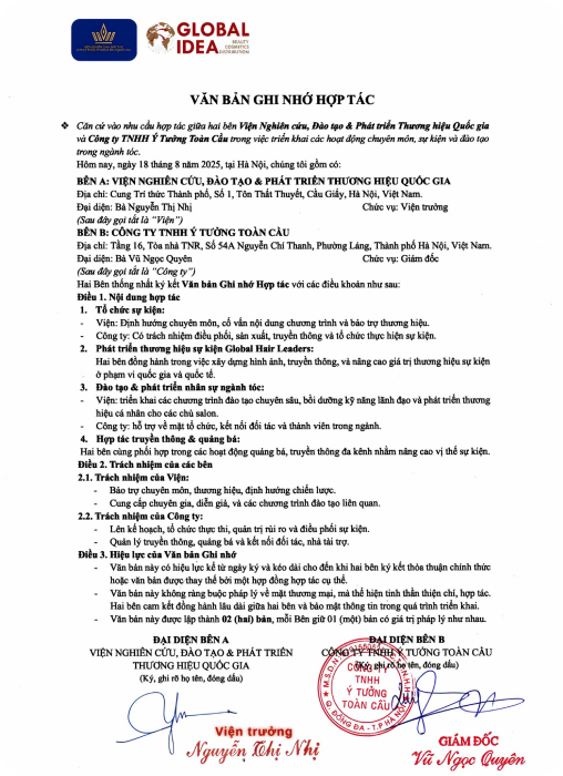 Global Hair Leaders đánh dấu cột mốc lần đầu tiên ngành tóc Việt Nam và Quốc tế có một Liên minh chính quy, được bảo trợ bởi Viện Nghiên cứu Đào tạo và Phát triển Thương hiệu Quốc gia, phối hợp cùng Miss Beauty Vietnam & International và nhà tài trợ Kim cương Global Idea. Đây không chỉ là một hội nghị chiến lược mà còn là nền tảng kiến tạo cộng đồng tinh hoa dành cho các chủ salon.